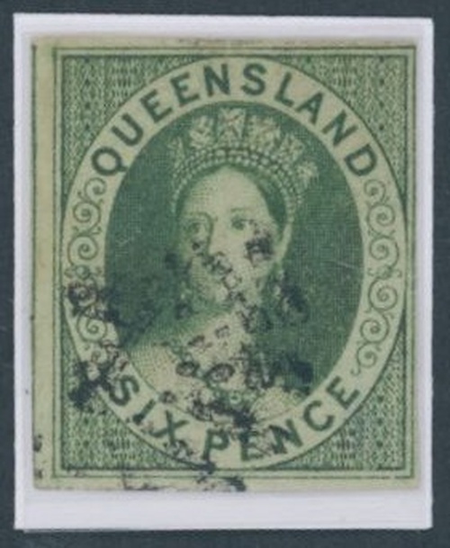 1860 watermark Large Star, imperf 6d. green with small to good margins on three sides, outer frameline touched at upper right, indistinctly cancelled, small violet handstamp on reverse, fine. S.G. 3, £950