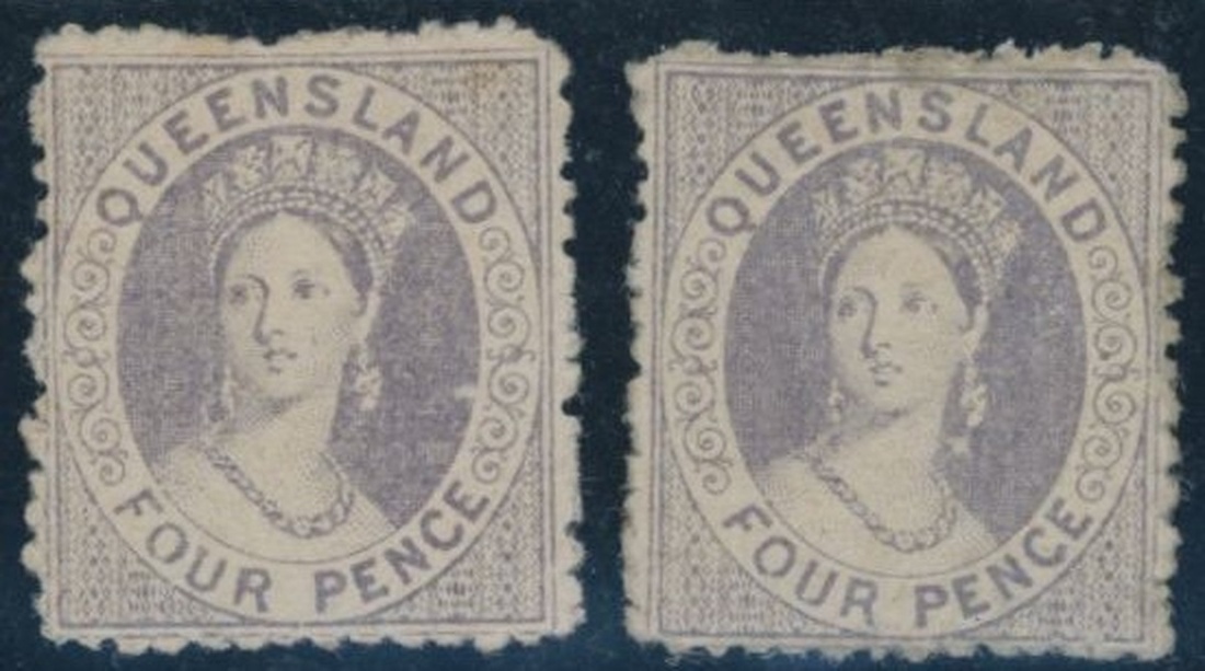 1866-67 lithographed on thick paper, no watermark, First Transfer 4d. reddish violet, two unused examples with large part original gum and small part original gum respectively, fine. S.G. 53, £1,000