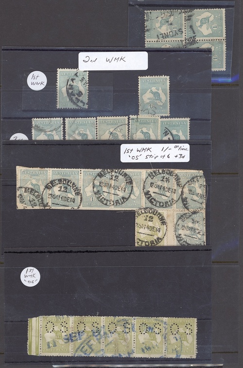 1913-1950 a mint, used and CTO collection arranged on ten Hagner's pages including Kangaroos up to £1, with singles and some multiples including 1/- perf OS strip of six used on piece. Watermark varieties including 2/- 3rd wmk. (BW37a) used (2). Mixed condition, an enjoyable lot to go through.