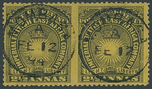2½a. black on bright yellow, horizontal pair variety imperforate between, used with clear