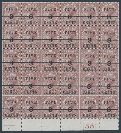 1891 Surcharges, a collection of 5c. on 3c. on 3d. and 15 on 6d. on 3d. which includes 5c. on 3c. on 3d. spaced "FI VE" variety part original gum and in a fine used block of four, variety broken bar used in a block of four, a mint lower margin block of thirty showing current number and several positional varieties neatly illustrated; 15 on 6d. on 3d. blocks of four mint and fine used, and variety offset doubling of the surcharge part to large part original gum single and pair (R.P.S. certificates). Also 1888 "TWO" in red on 50c. part original gum (R.P.S. certificate). (55)