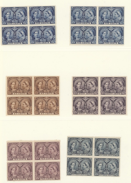 1897 Jubilee ½c. to 50c. group of blocks of four (14) including extra shades of the 1c., 2c. and 5c.; small thin spots on one stamp on ½c. and 50c. blocks otherwise fine. S.G. 121-135 group £4,000+