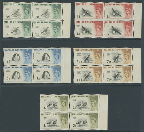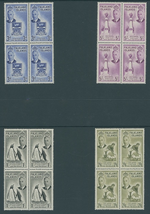 1938-66 mint group of sets in blocks of four comprising 1938-52 group of thirty-one blocks including a range of shades with 1/- (3, Heijtz 88a, 88c and S.G. 158c), 2/6d. (3, with Heitjz 90b and 90d), 5/- (2, S.G. 161 and 161c), 10/- black and red-orange imprint block and £1 grey-black bluish violet corner block, 1952 set to £1 (2 sets, one marginal and with shades) and 1960-66 set to £1 in marginal blocks; the majority unmounted mint, fine to very fine