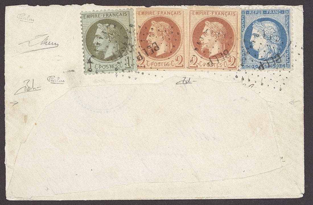 1871 (Sept.) envelope bearing 1c., 2c. variety imperforate (2), and 1870 Siege of Paris 20c. cancelled by