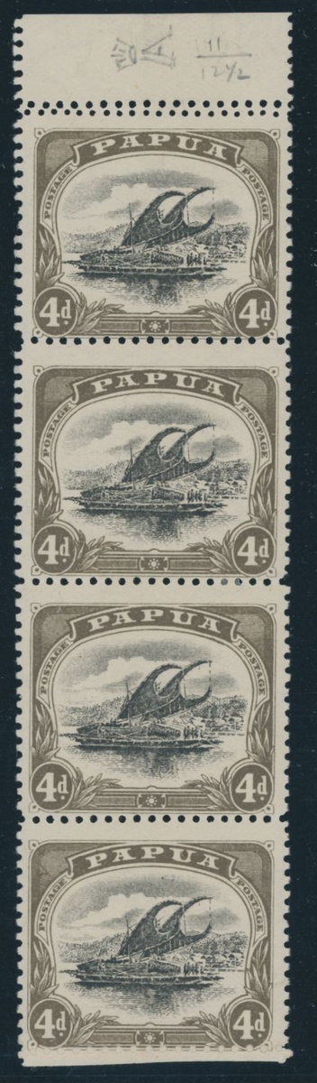 Notes: This variety occured only on the top row comprising five columns in a single sheet. The printer considered that the misplaced line of perf. 11 needed to be corrected with a further line - perf. 12½. From this row of five, positions 1-3 form a poor horizontal strip of three (illustrated on Pg. 361 of the Robson Lowe Encyclopaedia, Vol. IV, and position 5 is in the Royal Philatelic Collection.