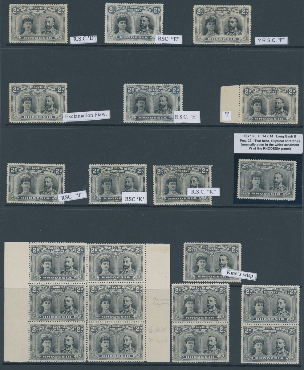 2d. mint group on Hagner pages (45) including a range of SG and RSC listed shades and with a few multiples including marginal vertical strips of three (2), vertical pairs (2) and a horizontal pair; a range of plated examples with plate flaws including King's wisp and constellation flaw; a good to fine group