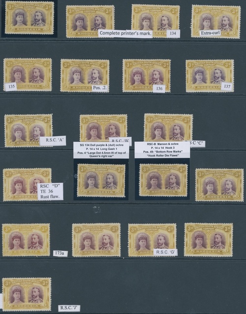 3d. mint group on a Hagner page (20) with a range of shades including purple and ochre, purple and yellow-ochre, magenta and ochre and violet and ochre as well as RSC shades, and with plate flaws including King's extra curl, printer's mark and rust flaw; also perf. 15 claret and pale yellow-ochre (slightly thinned at top); a good to fine group