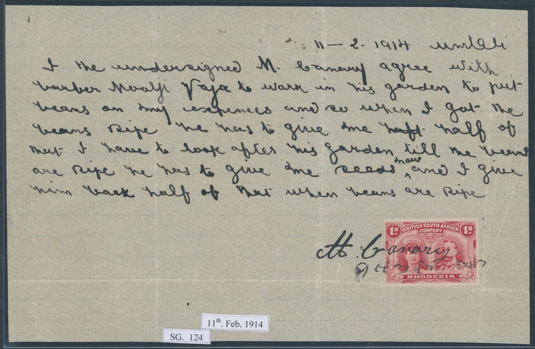 A trio of documents comprising 1911 (Nov.) Court Summons document bearing Arms 3d. (5) in combination with Double Head ½d., 3d. and 4d. all with manuscript cancellations in red; 1912 (Dec.) 'W. Bridgman' auction invoice bearing ½d. pair with manuscript cancellations and 1914 (Feb.) handwritten affidavit bearing 1d. with manuscript cancellation; a good group (3)