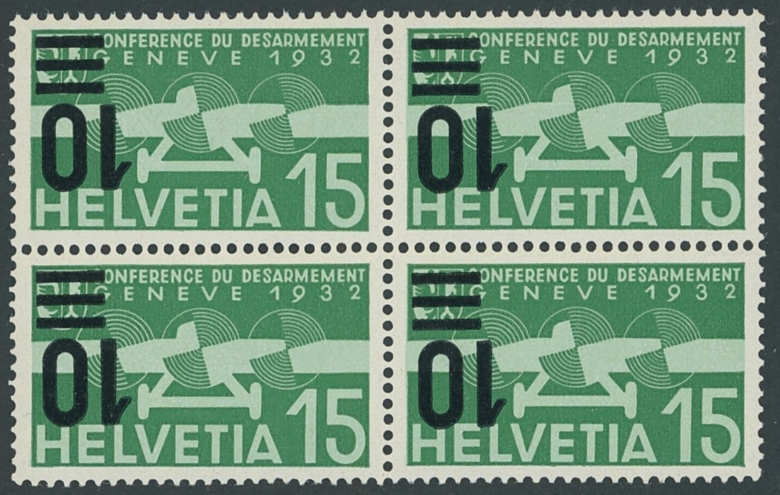 1935-37 Airmail 10c. on 15c. light green and green block of four, variety surcharge inverted, unmounted mint. A wonderful exhibition showpiece of superlative quality, extremely scarce as a multiple from the one sheet of fifty, small expert handstamp on the reverse of each stamp and one with small ink mark. S.G. 359a, £40,000+; Zum. 20. 1A.09, CHF 68,000 +