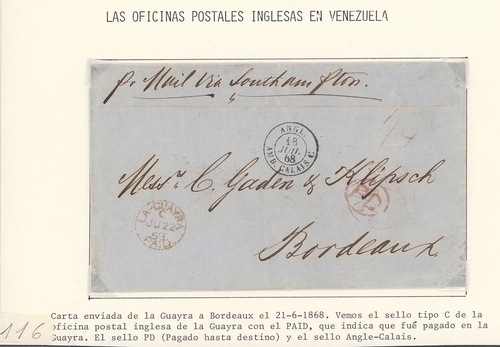 1844-77, choice group of eleven covers, including Anglo-French accountancy markings featuring articles 12 (2), 13 (3) and 18, with British d.s. of Puerto Cabello and La Guaira, including one unusual Venezuelan “Páez” pre-philatelic marking, one Panama transit, prepaid c.d.s. of La Guaira and Ciudad Bolivar. An interesting and varied group.