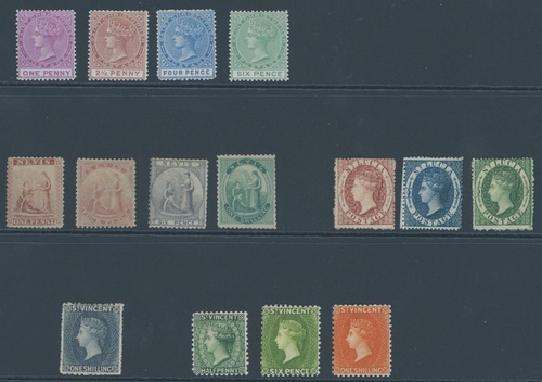 1860-84 mint group on a Hagner page comprising St. Christopher 1870-82 CC perf. 14 1d. to 6d., Nevis 1862 1d., 4d., 6d. and 1/- , St. Lucia 1860 1d., 4d. and 6d and St. Vincent 1866 1/- slate-grey and 1883-84 CA ½d. green, 6d. bright green and 1/- orange-vermilion; good to fine mint. Behr Certificates (2016) for all groups. S.G. £2,600+