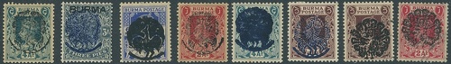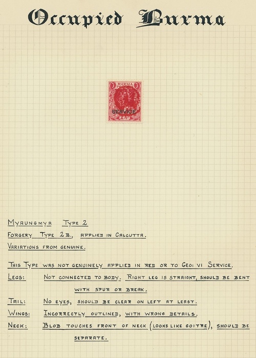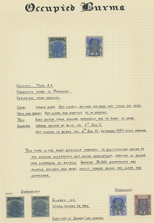 1942 (May) overprinted at Myaungmya, Type 1 on KGV 9p., 1a.6p. and Official 6a., on KGVI 9p. and 4a. (B.P.A. certificate, 2019) and Official 3p., 6p., 1a., 2a. block of four and 4a. (3), and Type 2 on KGVI 3p., 6p., 9p., 1a., 2a. and 4a.; handstamped at Pyapon Type 4 6p., 1a. and 2a.; and overprinted at Henzada Type 5 on KGV 3p. (2, one with overprint double), 9p. (2, one with B.P.A. certificate, 1960) and 2a., on KGVI 1p., 6p. (2), 1a. (6 including a block of four), 1½a., 2a. (2), 4a. and Official 3p., 6p. and 1½a., fine mint and Henzada KGV 3p. (6 including a block of four) and KGVI 3p. and 1½a. (3) used on three postal stationery pieces, and overprinted at Myaungmya Type 6a. on 8a. (4). Also a group of forgeries of the various overprints (39), all neatly mounted and written-up. A mainly fine lot. Cat. £3,800+