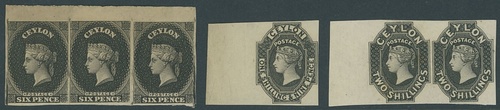 1d. and 1/9d. (margin at left) singles, 4d., 6d. and 2/- (margin at left) horizontal pairs, and 6d. horizontal strip of three (margin at top), all in black on unwatermarked wove paper, one 6d. with light crease and tone spot otherwise fine