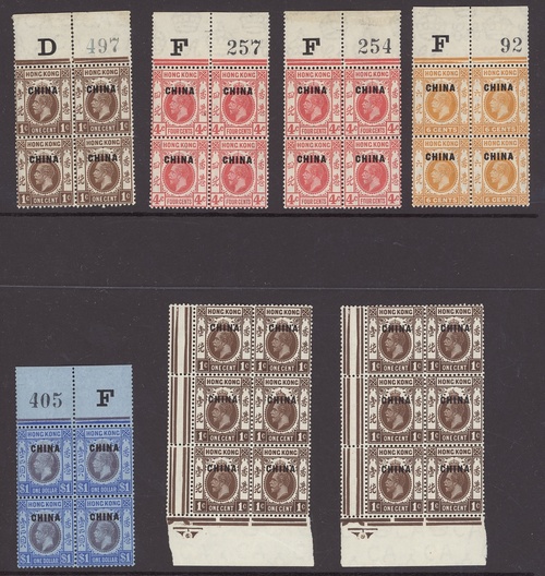 Duplicated unmounted collection including 1917-21 1c. block of four with requisition 'D' 497 in top margin, 1c. brown with Crown broken at right (6) in positional horizontal pairs (4) or block of six (2), 1922-27 4c. (2), 6c. and $1 in blocks of four with requisition 'F' in top margin. 1922-27 1c. in lower right corner block of twelve (10). Also a selection of values to $1 cancelled on the last day of the agreement with the Chinese (30 Nov. 22). In addition a few extra postal cards from Japan. Generally fine, a very interesting lot.