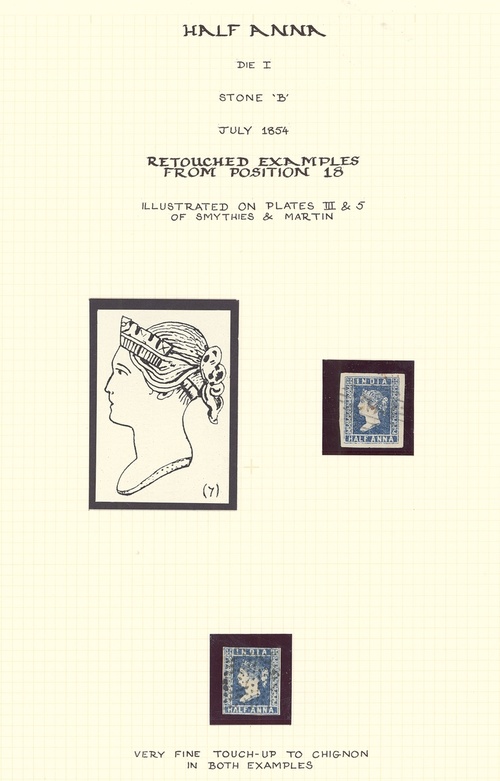 A specialised, used selection of singles (19) and example on cover, well presented on album pages (7) including Stone A 6th group (8), three examples varying from extremely worn to slightly worn, four examples from early to late printing and single with rare experimental circle of dots cancellation; Stone A2 6th group, [78] band not shaded and no top line; Stone A3, 6th group, [30], hair on neck and band shaded, Position 54, band not shaded and no top line, [78] band not shaded and no top line; 9th group A2 stone single, possible 'X2' single and single of unknown stone showing characteristics of this group, tied to 1855 (May) entire; Stones B and B2, Position 1 (3), one with flaw in right leg of 1st "