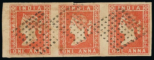 A horizontal strip of three, [84-86], clear margins all round, lightly cancelled by diamond of dots, part offset of the address on reverse, fine and scarce. Photo.