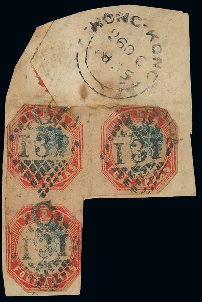 An irregular block of three cancelled by '131' diamond of dots (Aleppy) and affixed to piece bearing Hong Kong 26.10.55 to which it likely does not belong; adhesives cut to shape and with faults though a scarce piece. S.G.25/26. Photo.