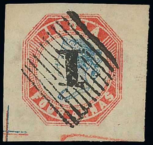 Deep blue and red, [10], cut square with enormous margins all round showing majority guide cross marking at lower left, crisply cancelled by '1' barred numeral, large hinge at top otherwise fine and exceptionally attractive. S.G. 26. Photo.