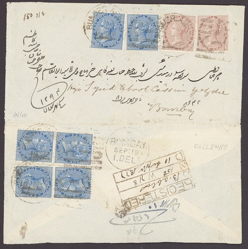 1879 (10 Sept.) envelope (opened-out for display) registered to Bombay, bearing ½a. pair and block of four (on reverse) and 1a. (2), all tied by "1/K-5" duplex (Type C9) and showing registration h.s. on reverse