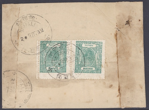 1928-32, perf. 11 1½a. turquoise-green horizontal pair tied by Silawad and Niwali 1935 d.s. to native envelope with additional Palsud transit d.s.; also 1937-47, close setting ½a. blue green pane of four centrally cancelled by Barwani d.s. and affixed to native envelope addressed to the Post master within Barwani. Generally fine and a scarce duo.