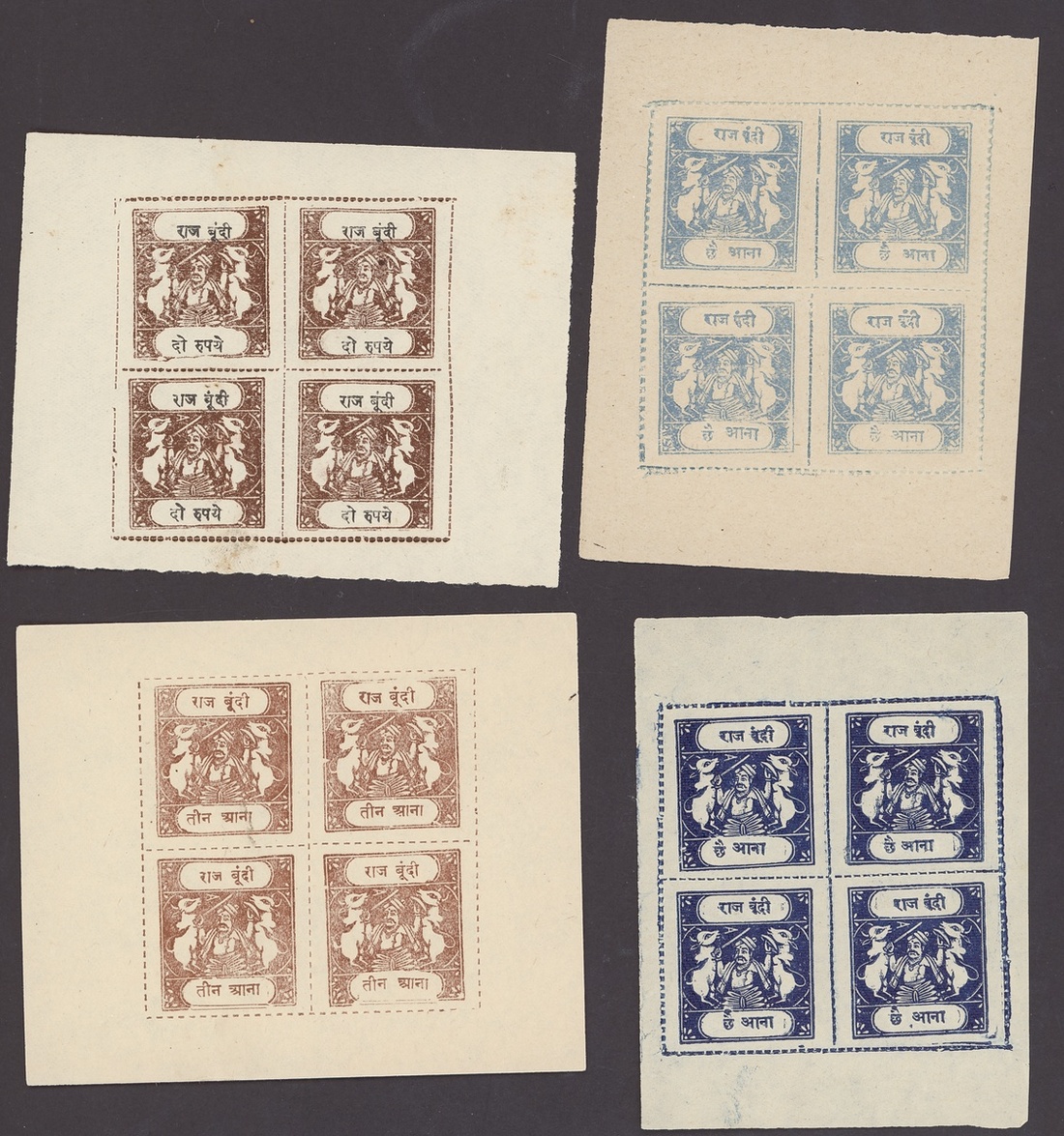 1914-41 Sacred Cows Group B 6a. pale ultramarine, deep ultramarine, Group C 2r. red-brown and black, Group E medium wove paper 3a. chocolate, and Group H, Perf. 11 2a. yellow green, all in complete sheetlets of four, the latter with complete original gum; also 1947 ¼a. blue-green complete sheet of twenty (4x5) showing sheet number '1235', tracing paper adhered to reverse. A good group. S.G. 33, 33a, 46a, 57, 76, 86, £514+