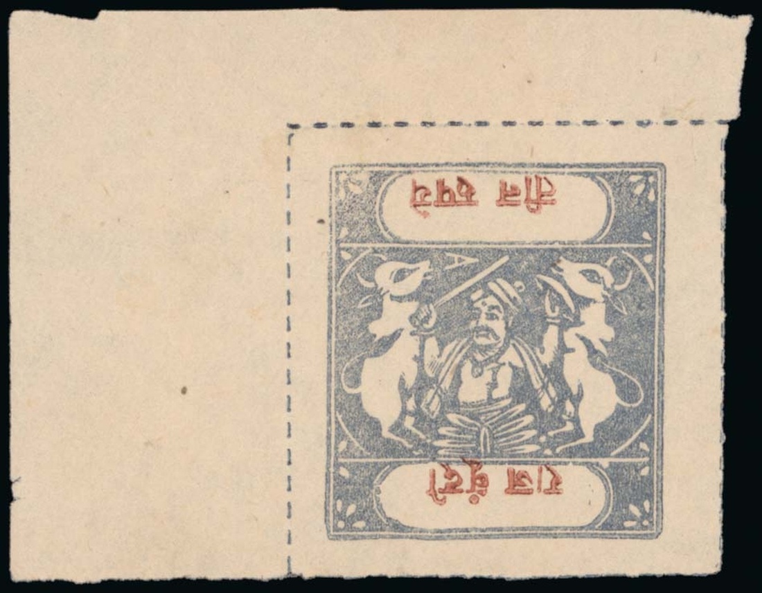 1914-41 Sacred Cows, Group C 3r. grey-blue and chocolate on medium wove paper, an upper left corner example with variety chocolate (inscriptions) inverted, very fine unused, a dramatic and most important rarity of Indian States and KGVI, there being only two known, the other, representing the stamp adjoining at right, was sold by Spink in 2007. S.G. 47ab, £40,000. Photo.