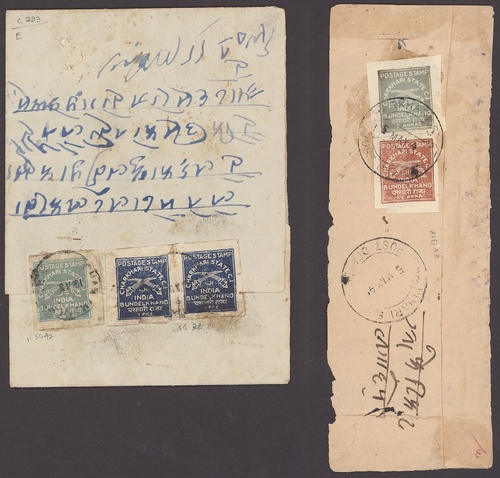 1909-19, Type II 1p. turquoise-blue tied by Charkhari State P.O. squared circle to unaddressed postcard; 1930-45 1p. pair and 2a. single tied to native envelope, the pair with tears; ½a. and 2a. tied by Charkhari State Post Office 05.05.4(?) double ring d.s. to piece from native envelope, sent registered. A good trio.