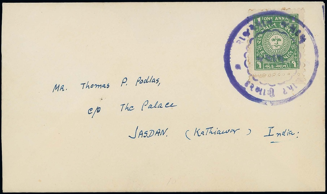 1942-47 1a. bluish green with part sheet margin at foot tied by violet Gujrati circular postmark to locally addressed envelope, unopened and very fine. B.P.A. Certificate (2018). S.G. 6. Photo.