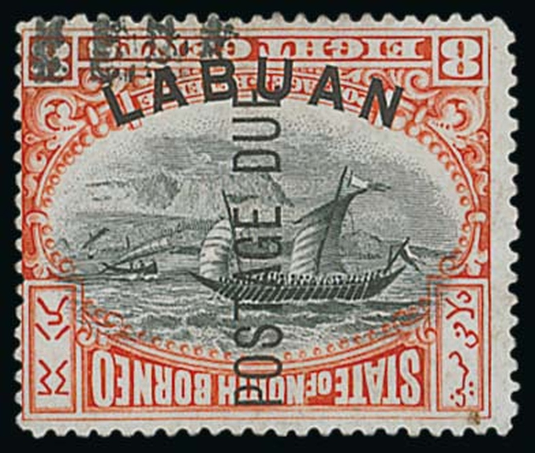 1901 perf. 14½-15 8c. black and vermilion frame inverted, discreetly cancelled to order as with all other examples, tiny surface mark at lower right otherwise fine and of fresh colour; an important rarity, there having been only around thirty examples recorded. R.P.S. Certificate 18466 not present. S.G. D6ba, £8,500. Photo.