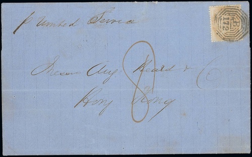 1863 (18 Aug.) entire letter ex the "Heard" correspondence to Hong Kong, marked "p United Service", bearing 1856 2a. yellow-buff clearly tied by fine "B/172" obliterator, showing manuscript "8" and, on reverse across join, framed