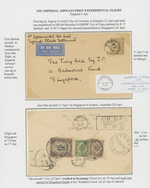 1931 (2 Apr.) envelope from London to Singapore, marked "1st Experimental Air Mail, England - Straits Settlements", franked at 1/- and showing special slogan arrival datestamp (16.4); 1931 (13 Apr.) envelope from Alor Star to Sydney, franked at 46c. (on reverse, some stained perfs) and showing Singapore (15.4) and arrival (29.4) datestamps; 1931 (29 Apr.) envelope from Singapore to India, marked "By Air Mail. Par Avion./Via Singapore/Delhi", franked at 22c., showing