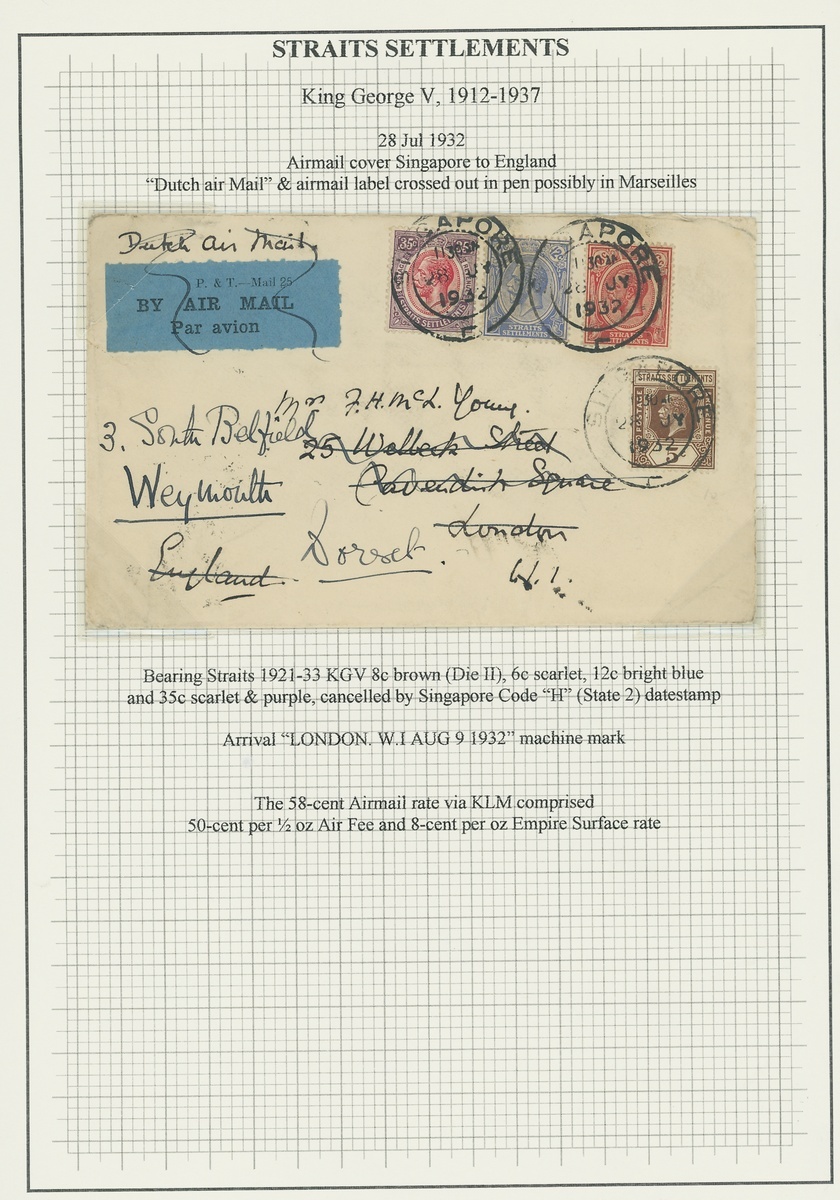 1932-35, a group of envelopes (13) flown by KLM, four by Dutch Air Mail to the UK, three from Alor Star to the UK, Switzerland and Paris, various frankings including 53c., 57c., 72c., 73c. etc. An interesting group.