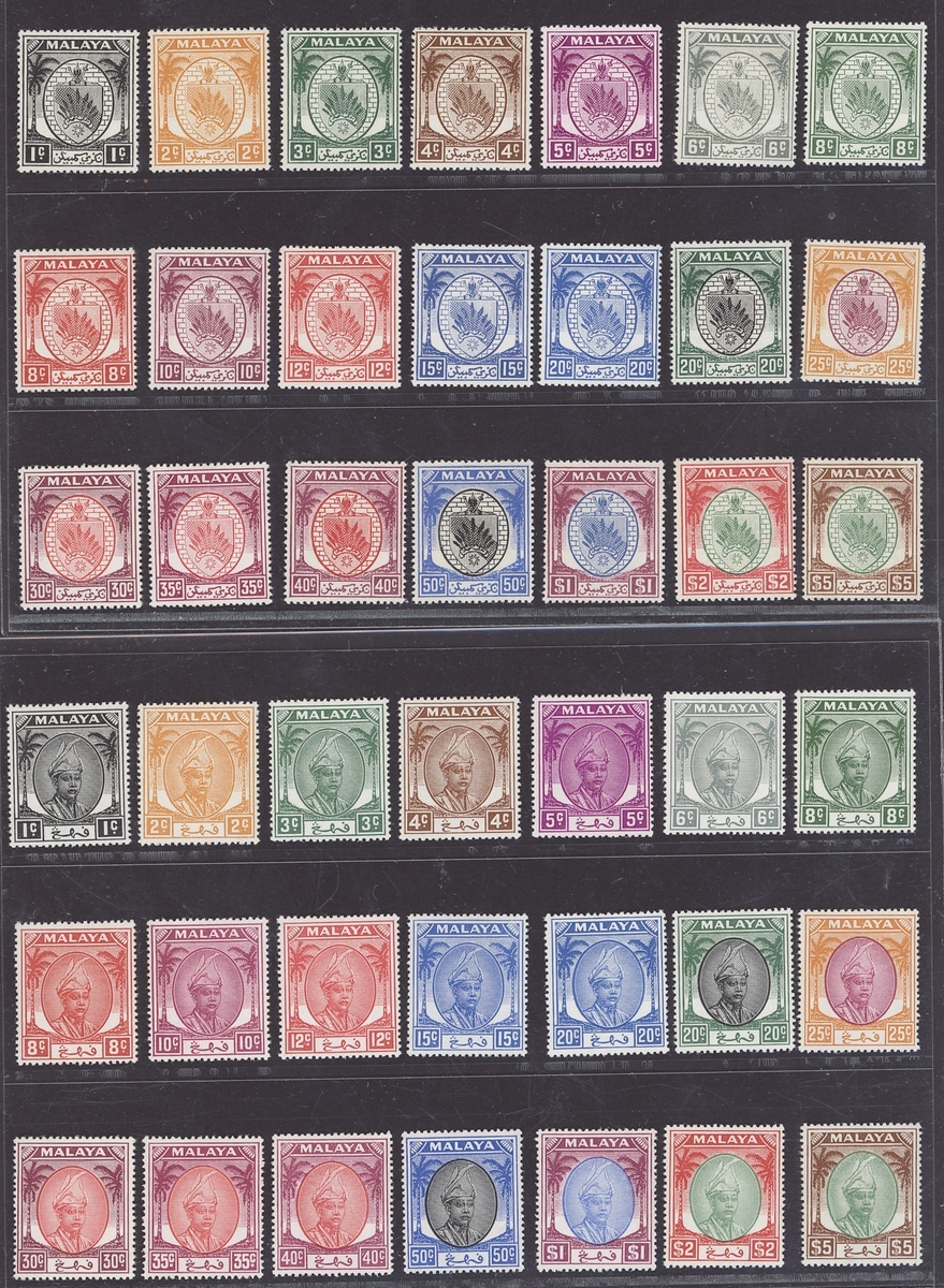 A mint KGVI and QE group comprising BMA 1945-48 1c. to $5 with some duplication, Johore 1949-58 1c. to $5, Kedah 1950-55 1c. to $5, Kelantan 1951-55 1c. to $5, Malacca 1954-57 1c. to $5, Negri Sembilan 1949-53 1c. to $5, Pahang 1950-56 1c. to $5, Penang 1949-52 1c. to $5 and 1954-57 1c. to $5, Perak 1950-56 1c. to $5, Perlis 1951-55 1c. to $5, Selangor 1949-55 1c. to $5, Singapore 1948-52 perf 17½x18 1c. to $5 and Trengganu 1949-55 1c. to $5, fine mint. Cat. £2,325