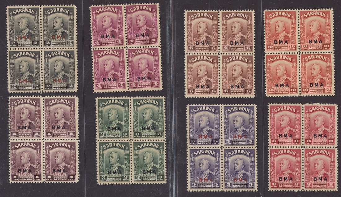 1945 (Dec.) BMA 1c. to $10 set of twenty in blocks of four, all gum toned though of fine appearance. S.G. 126-145, £2,200