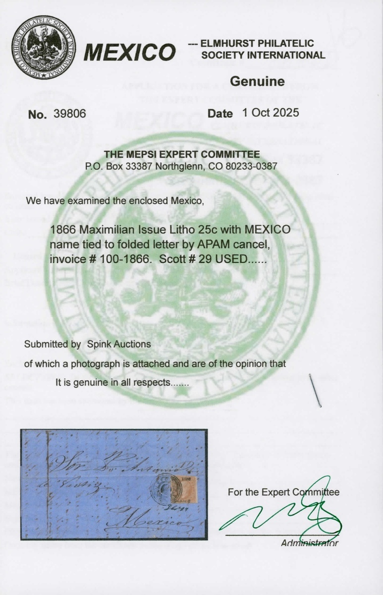 Mexico-Otumba 25c. Orange Lithographed (#100-1866) with Mexico overprint, close to good margins except for one slightly cutting into, on pristine entire letter from Apam to Mexico on December 28, 1866, tied by an attractive circular h.s. This was a direct shipment to Mr. Solares in Otumba in exchange for demonetized obsolete Eagles, and is very rare, as only 54 were sent. Maybe two covers are known. 2025 MEPSI certificate. Scott 29; NF $500 as a single off cover.