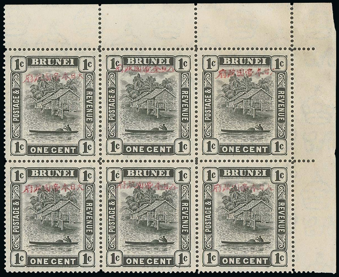 1c. black top right corner block of six (3x2) with red overprint, minor bends and some split perfs at right, fine unmounted mint. B.P.A. Certificate (2020). ISC J1c, $2,400; S.G. 1b, £1,500. Photo