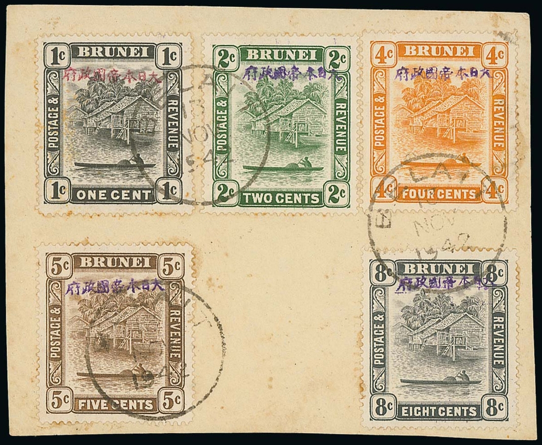 1c. with red overprint, 2c. green, 4c., 5c. and 8c. grey-black, all on piece tied by Belait c.d.s. (13.11.42), the odd perf with affixative stain otherwise fine. Rare. B.P.A. Certificate (2019). ISC J1c, J2, J5-J6, J9, $4,880; S.G. J1b, J2 J5-J6, J9, £1,411. Photo