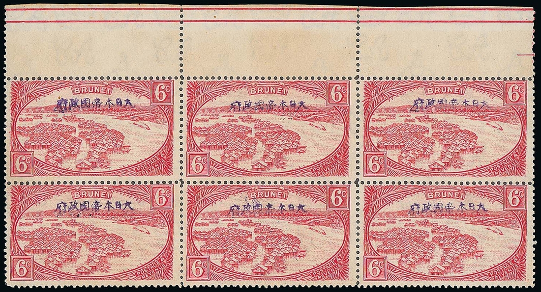 6c. scarlet block of six (3x2) with margin at top and violet overprint, gum a little more browned than normally found, fine unmounted mint. A rare multiple. ISC J8, $13,800; S.G. J8, £3,900. Photo