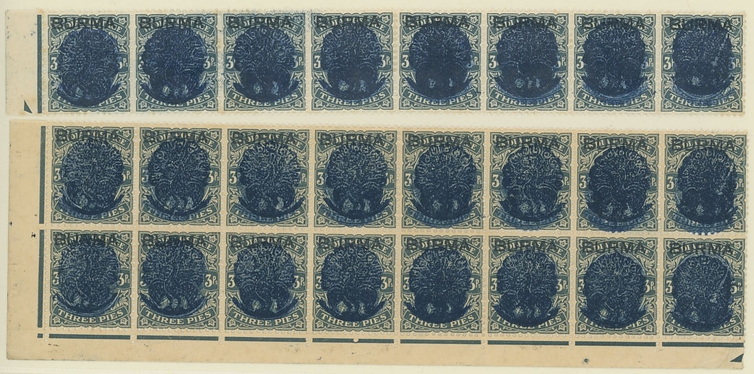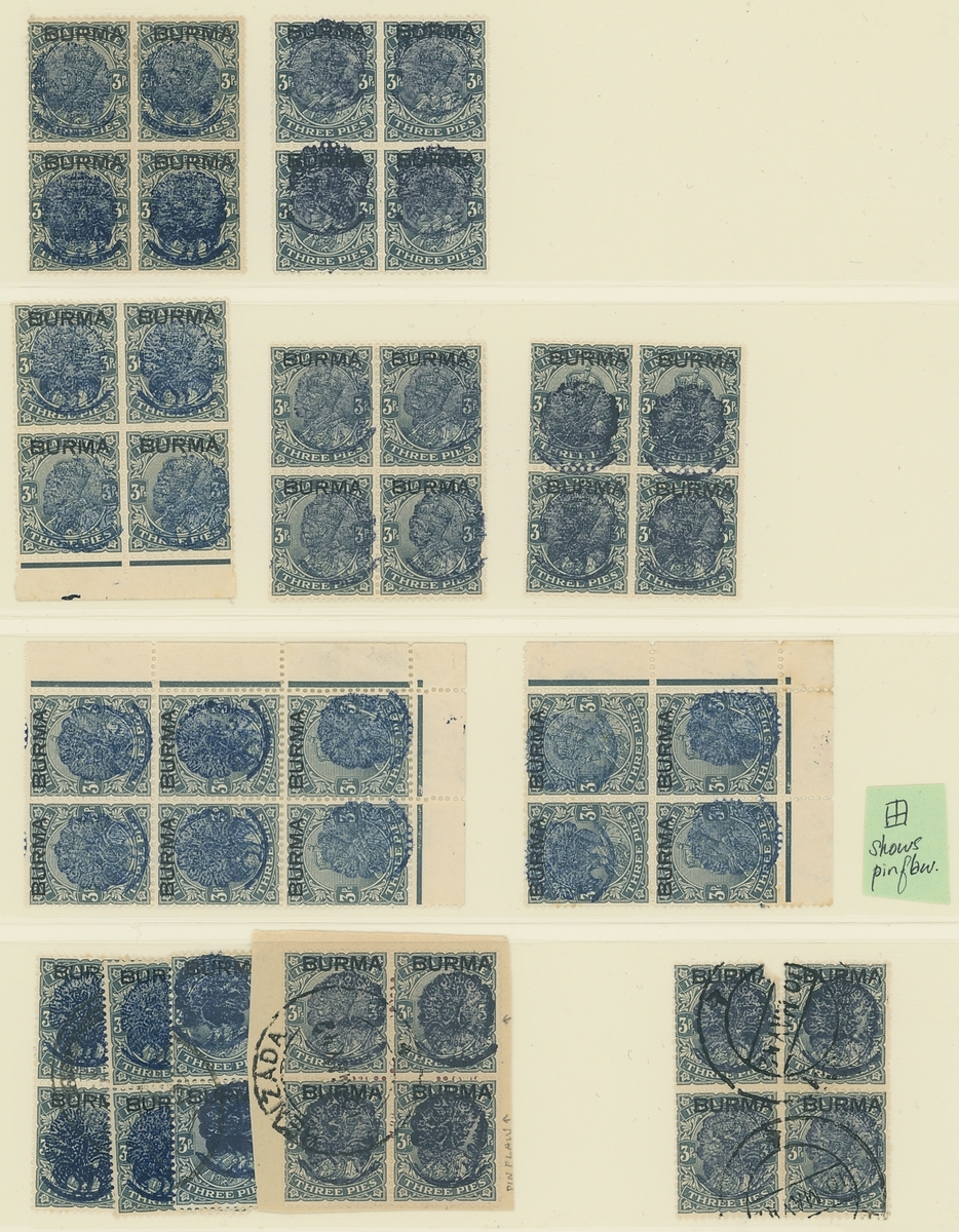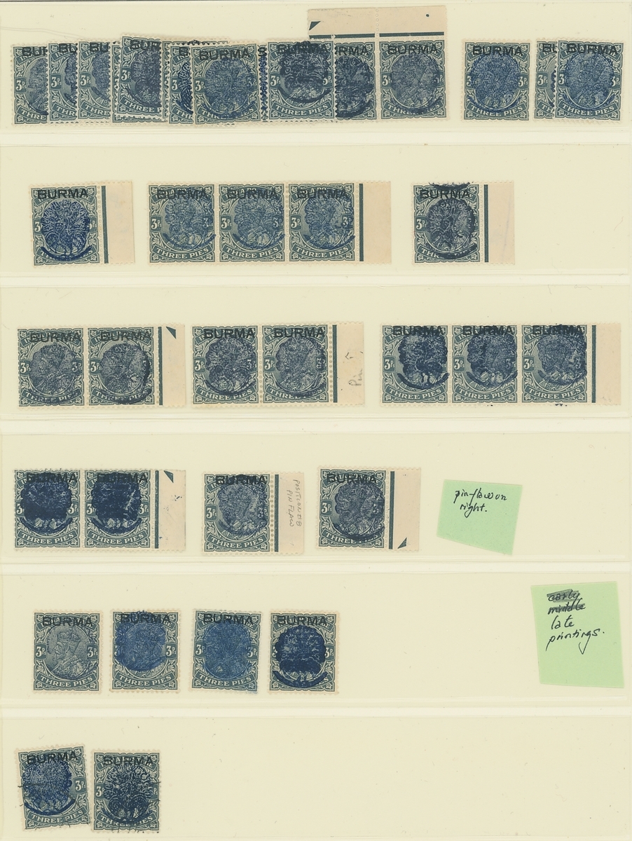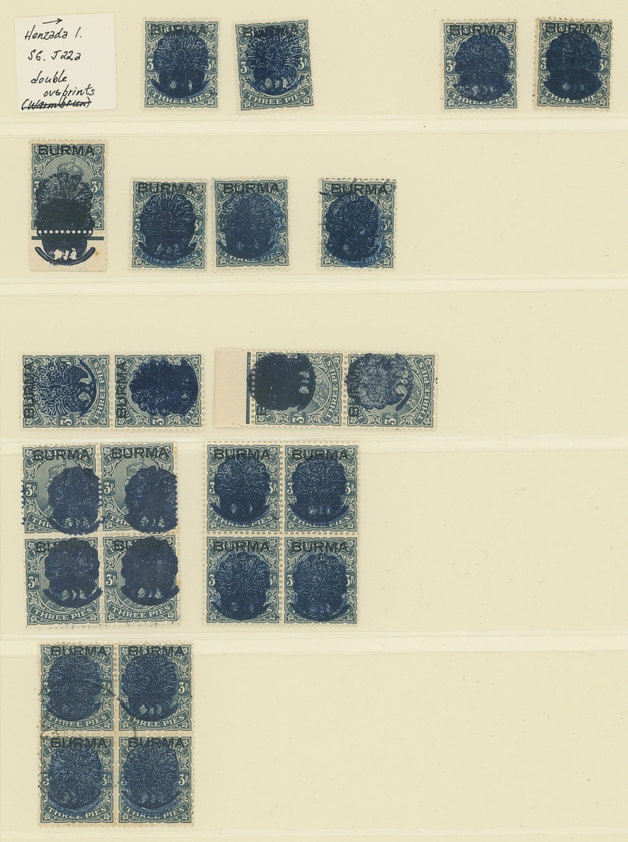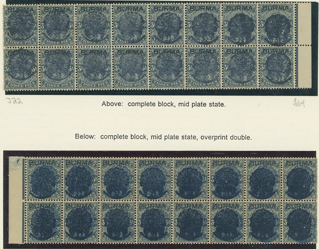 3p. slate, a mint collection highlighting the pin flaw (171, twenty-five used including six blocks of four) showing various states and colours of the overprint, including a right marginal block of sixteen (8x2) with the last column in each showing pin flaw, lower right corner blocks of six and four showing pin flaw, a strip of three highlighting no pin flaw, pairs (3) and singles showing progressive pin flaws, two blocks of sixteen (8x2) with margin at left, blocks of four (3, one used), strip of eight showing pin flaw, vertical pairs (2) and singles (8, one used) showing overprint double, the vertical pairs se-tenant with normals; mostly fine. A great opportunity for specialist study of these interesting overprints and pin flaws. S.G. J22, £1,200+. (167 stamps)