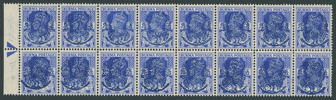 6p. bright blue block of sixteen (8x2) with margin at right and showing no discernible flaws, therefore prior to the pin flaw occurring, unused with full original gum, fine. An important piece. S.G. J27, £416+