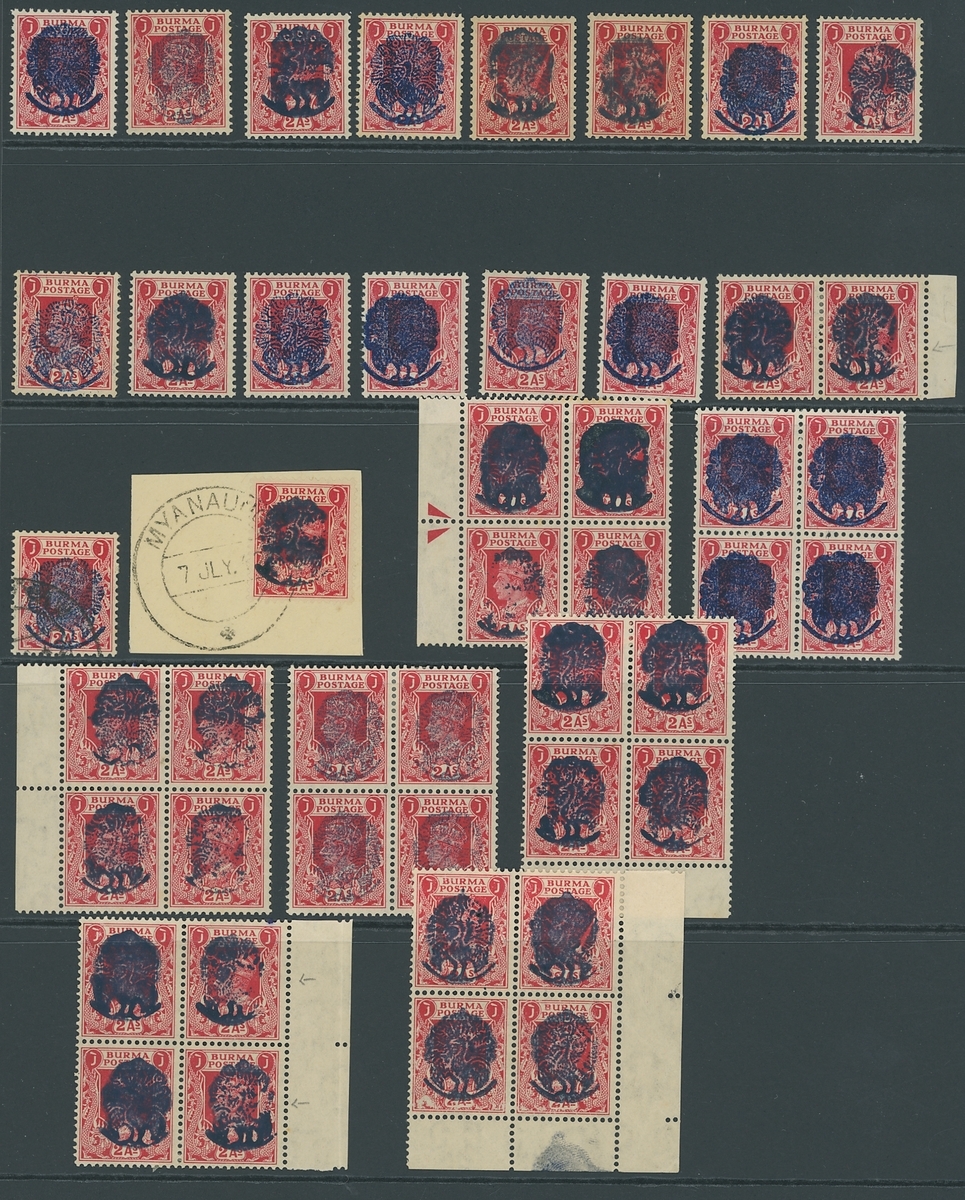2a. carmine, a mint range showing the various States of the overprint, comprising blocks of four (7, two right marginal showing pin flaw in the right column), a right marginal pair with pin flaw and singles (16, two used, one on piece), some with initials on reverse, mostly fine. S.G. J31, £1,240