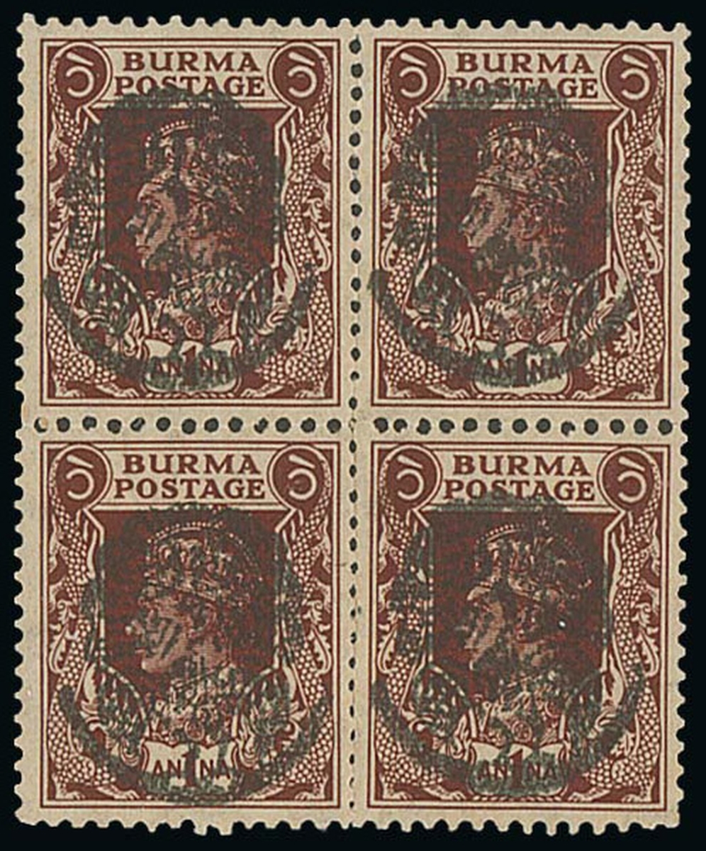 Much controversy surrounds this overprint. It has been de-listed by Gibbons and Scott. Articles have been written that show that this overprint was only used on postal stationery and that these stamps were created in 1945, thus are bogus. Others have shown blocks that have both Type 5 and Type 6 se-tenant - therefore may have been printed in 1942. The overprint has a much more extended basal arc reaching the shoulders of the peacock and was applied one at a time, therefore there are no sub-types.