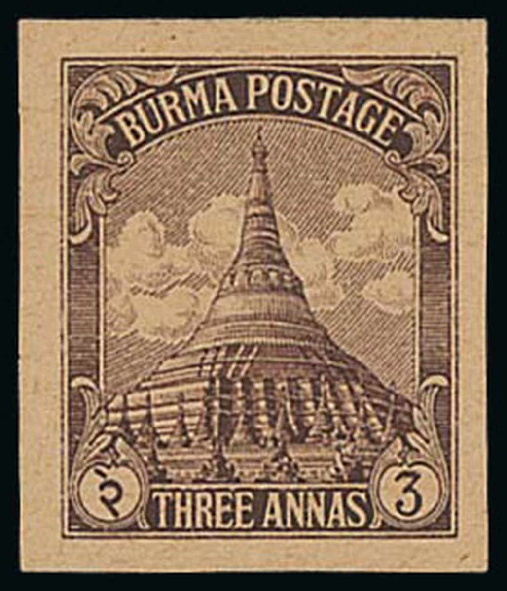Note: These trials were printed in Japan for use in Burma. It became apparent that these stamps could be produced by the Koff Printing C. Ltd. in Batavia, Java so production was halted in Japan. There are Kasumi Kei marks at the edge of the sheet indicating that these stamps were an official trial although there is no printing office name on the sheet.