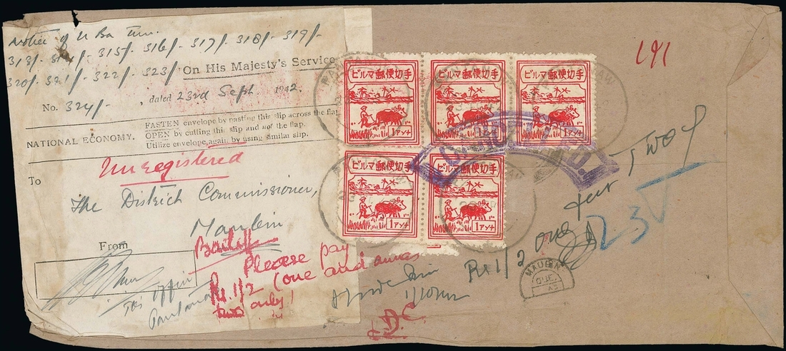 1942 (23 Feb.) re-used OHMS envelope, originally bearing 1a. which has been removed, to Maubin bearing, on reverse, OHMS label and bearing a strip of three and a pair cancelled by Pantanaw c.d.s and overstruck by large curved