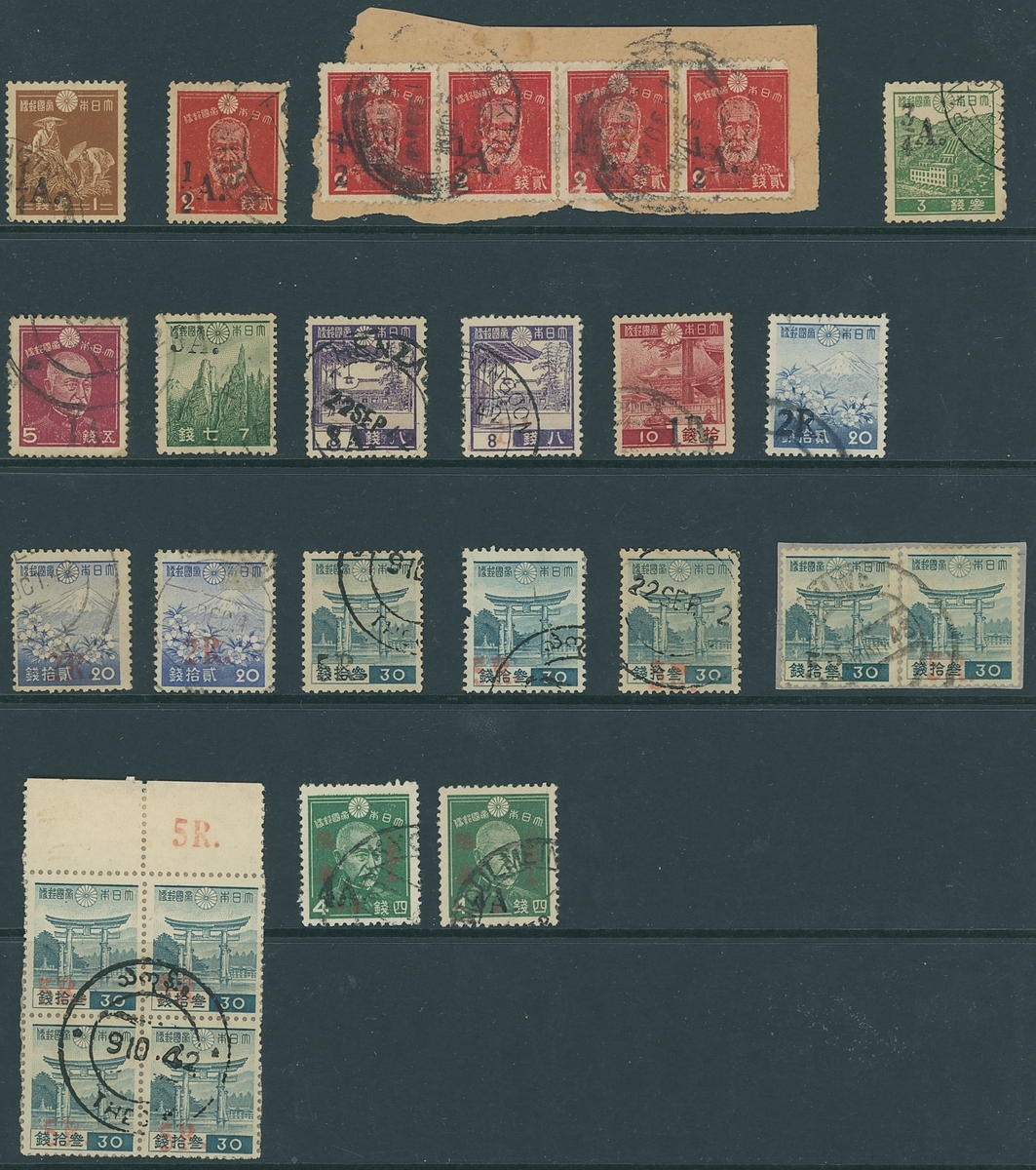 ¼a. on 1s., ½a. on 2s. (5 including a strip of four on piece), ¾a. on 3s., 1a. on 5s., 3a. on 7s., 8a. in black and in red on 8s., 2r. in black (2) and in red on 20s., 5r. in black and in red (6 including a top marginal block of four showing surcharge impression in selvedge; one lightly toned) on 30s., 5r. on 30s. horizontal pair with black and red surcharges se-tenant and Fall of Singapore 4a. on 4+2s. (2), all used, mostly fine. S.G. J47-J56g, £1,980+