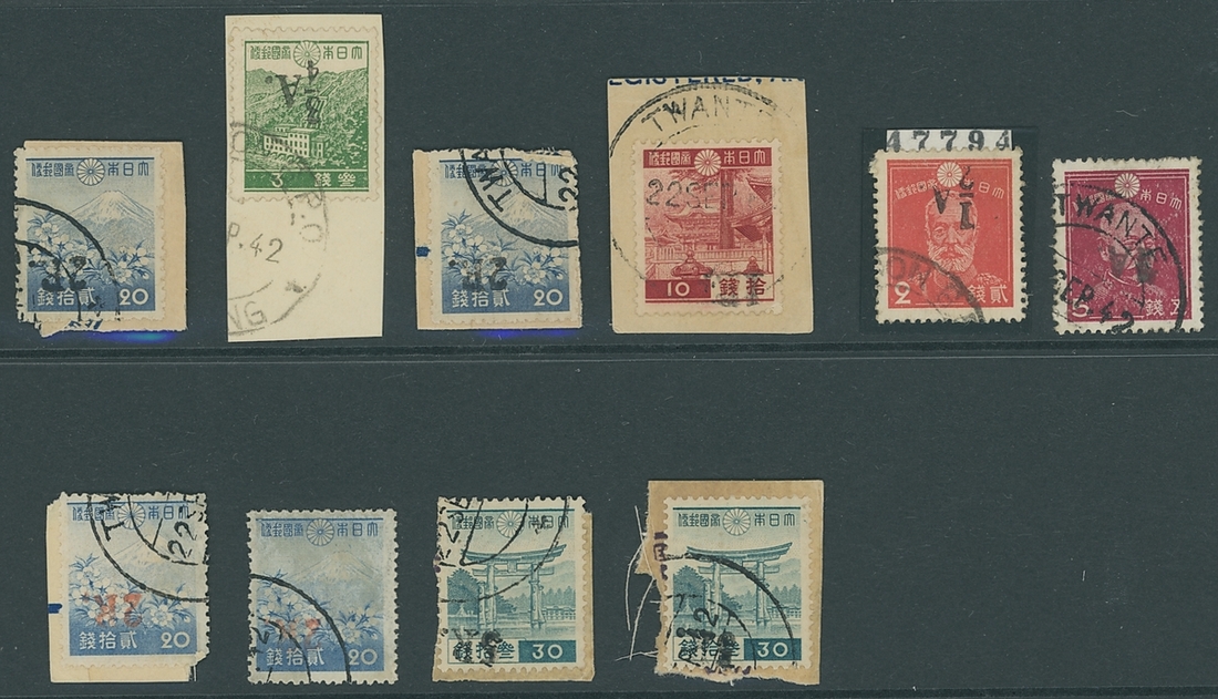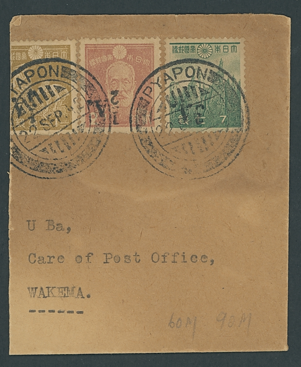½a. on 2s., ¾a. on 3s. (on piece), 1a. on 5s., 1r. on 10s. (on piece), 2r. in black (2) and in red (2) on 20s., and 5r. in black on 30s. (2), all with surcharge inverted, fine used, also ¼a. on 1s. (portion of left side cut off), ½a. on 2s. (discoloured) and 3a. on 7s., all with surcharge inverted on part 1942 (22 Sept.) envelope from Pyapon to Wakema. S.G. J48a, J49a, J50a, J54a, J55a, £1,140+ (some unpriced)