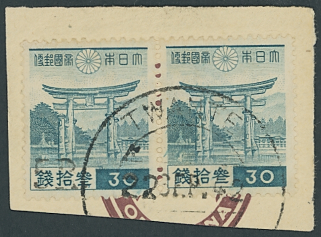 5r. in black on 30s. turquoise horizontal pair, the right stamp with surcharge omitted, tied by Twante double-ring d.s. (22.9.42) on piece of stationery envelope, fine. S.G. J56d, £350