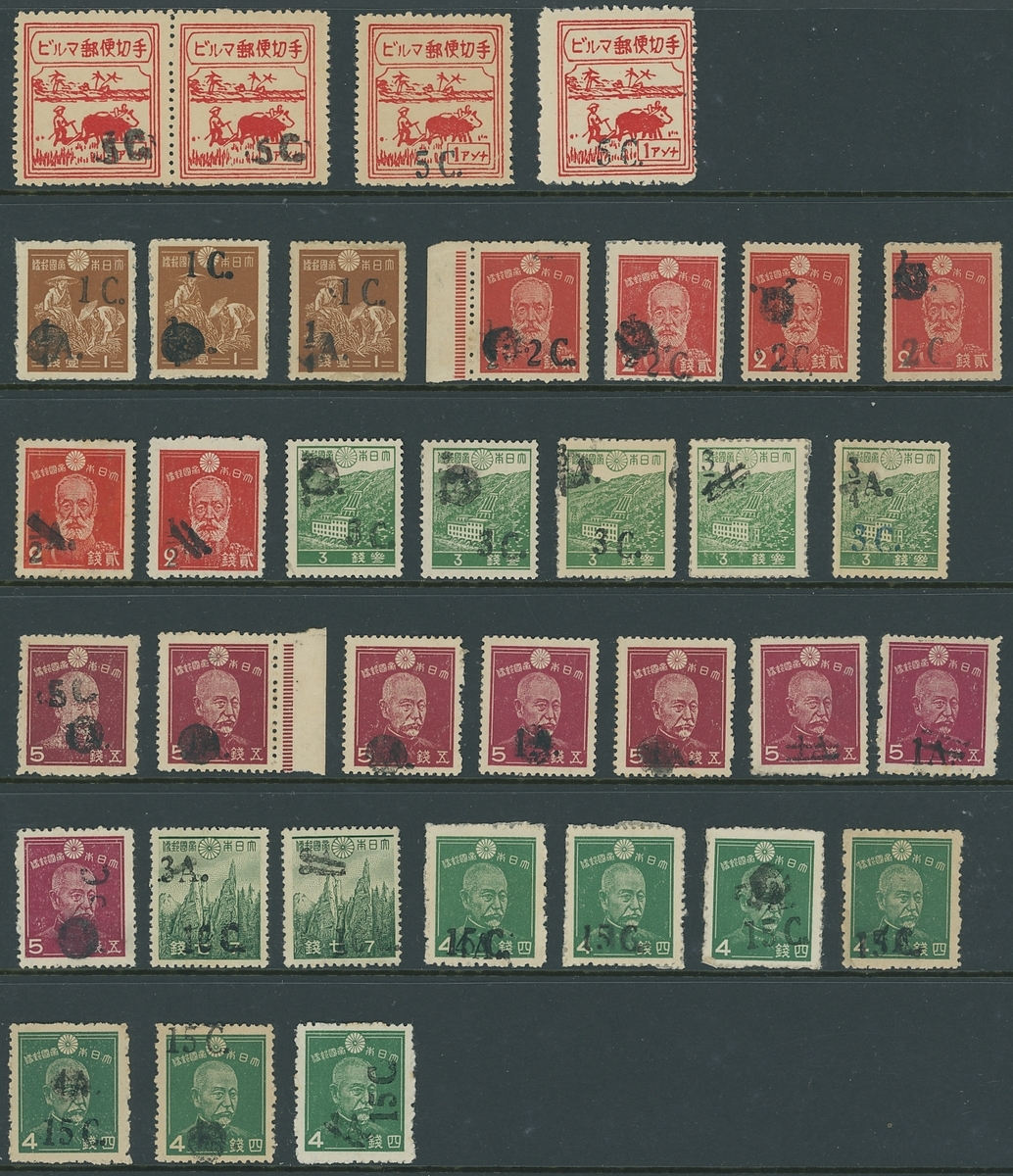 An unused range comprising Farmer 5c. on 1a. (4 including a pair with one showing surcharge partially double) and Pictorial 1c. on ¼a. on 1s. (3), 2c. on ½a. on 2s. (6), 3c. on ¾a. on 3s. (5, one with surcharge in blue for use in Shan States, initialled "MDR"), 5c. on 1a. on 5s. (8, one with "5c" sideways), 10c. on 3a. on 7s. (2) and 15c. on 4a. on 4s. (7, one with "15c" sideways), some with interleaving paper, mostly fine. S.G. J57-J63, £2,564+