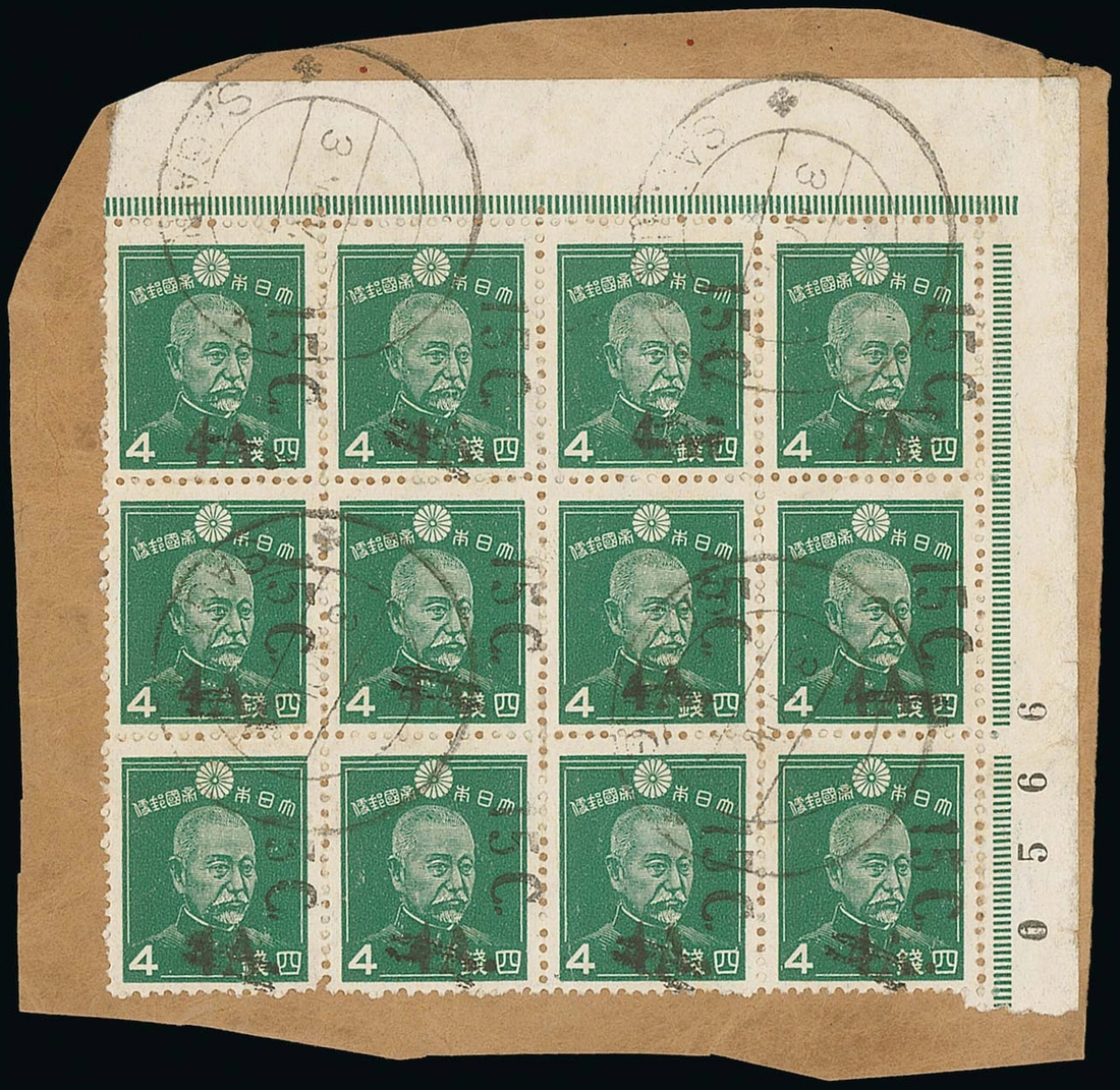 15c. on 4a. on 4s. emerald, a top right corner block of twelve (4x3) with variety "15C" sideways, on piece cancelled by Sagaing datestamp (3.11), some creasing though a rare and possibly the largest known multiple. B.P.A. Certificate (2019). JSCA B57a, Y312,000; S.G. J63 unlisted variety. Photo