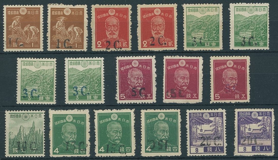 An unused range comprising 1c. on 1s. (2), 2c. on 2s. (2), 3c. on 3s. (4, two with surcharge in blue), 5c. on 5s. (3, one with surcharge in violet), 10c. on 7s., 15c. on 4s. (3, one with surcharge inverted) and 20c. on 8s. (2), mostly fine. Five initialled "MDR". S.G. J65-J71, £1,915